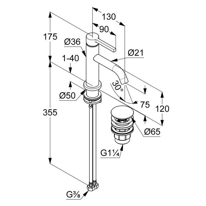 KLUDI-NOVA FONTE PURA однорычажный смеситель на умывальник 75 литой рычаг монтаж на одно отверстие расход воды 4,5 л/мин при давлении 3 бара аэратор s-pointer Caché M 18,5 x 1 донный клапан PUSH-OPEN гибкая подводка G 3/8 крепежные элементы высота излива 75 мм