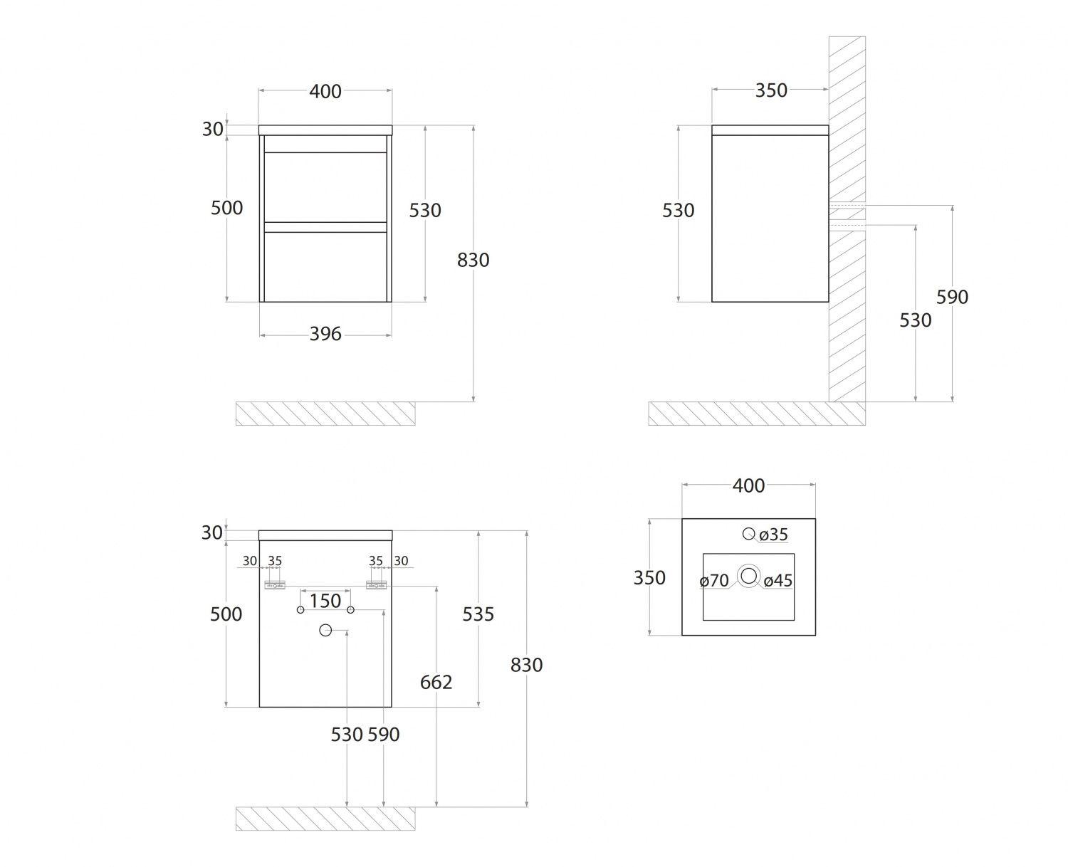 Установка комплекта. Тумба с раковиной (+ смеситель, + сифон), зеркало / зеркало-шкаф до 70 см.
